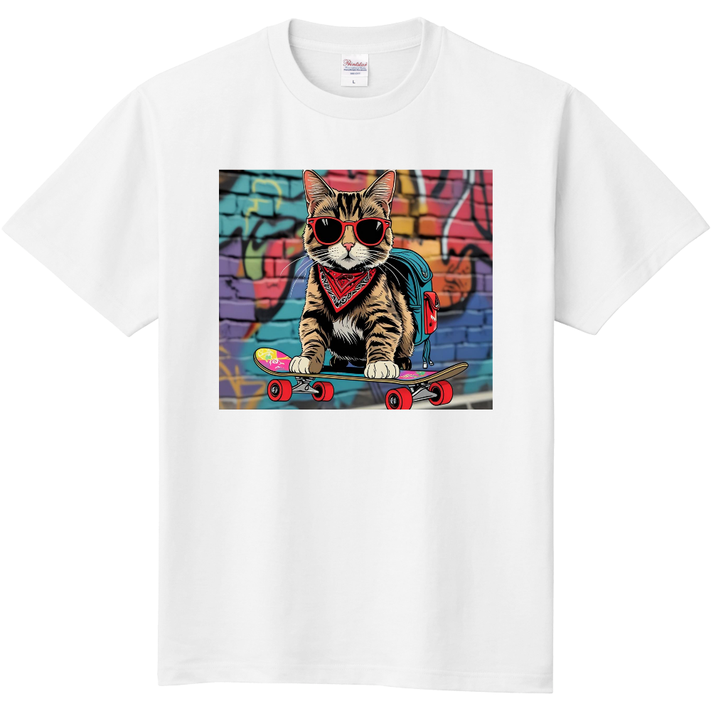 クールなサングラスにバンダナ、スケボーを乗りこなす姿がインパクト抜群のデザインTシャツ。